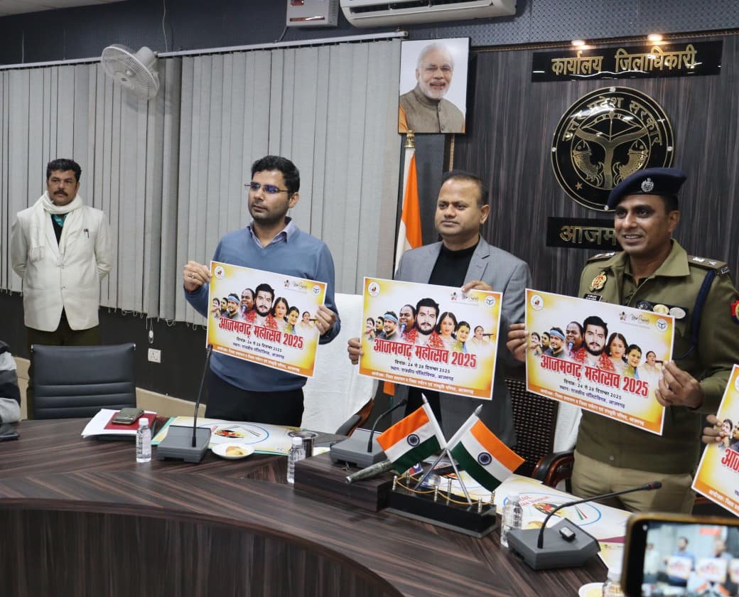 आजमगढ़ : दिनांक 24 दिसंबर से 28 दिसंबर 2025 तक राजकीय पॉलिटेक्निक कालेज आजमगढ़ के मैदान में आजमगढ़ महोत्सव-2025 का आयोजन किया जा रहा है। उक्त के क्रम में आज जिलाधिकारी श्री रविंद्र कुमार एवं वरिष्ठ पुलिस अधीक्षक डॉ0 अनिल कुमार द्वारा कलेक्ट्रेट सभागार में प्रिंट/इलेक्ट्रॉनिक एवं सोशल मीडिया की उपस्थिति में आजमगढ़ महोत्सव-2025 के लोगो, पोस्टर तथा थीम सॉन्ग को लॉन्च किया गया।